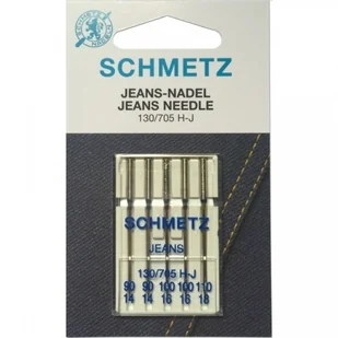 Igły półpłaskie Schmetz 130/705 H-J do jeansu przeznaczone do maszyn domowych. Opakowanie zawiera 5 sztuk igieł o grubości: 2x90, 2x100, 1x110. Igły SCHMETZ do jeansu (denimu), skaju, folii, ceraty. Warto wiedzieć: