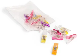 Zestaw 20 klipsów do materiału, w różnych kolorach. Zapakowanych w mocny woreczek strunowy, dzięki czemu, masz wszystko uporządkowane. Klipsy do szycia zostały zaprojektowane tak by wygodnie przytrzymać szyty materiał lub upiąć go, bez ryzyka ukłucia. Klipsy świetnie sprawdzą się podczas szycia patchworku, podczas łączenia ze sobą wielu warstw materiałów (tzw. kanapkowaniu). Doskonałe przy pracy z delikatnymi tkaninami, ale też przy cięższych materiałach, jak jeans czy skóra - nie będą się przemieszczać jak tradycyjne szpilki.