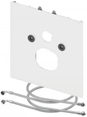 Dolna szklana płyta toaletowa w połączeniu z ceramiką toaletową TECEone z funkcją bidetu, w tym zestaw izolacji akustycznej, a także podłączanie węży do podłączenia ciepłej i zimnej wody do standardowych zaworów kątowych.