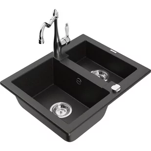 Czarny/Złoty metalik Kolor baterii: Chrom Dane techniczne: Zlewozmywak: Rozmiar: 582x475x177 mm Głębokość komory: 162 mm (większa), 102 mm (mniejsza) Wymiary komory:
