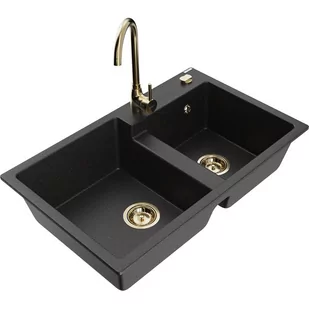 Czarny/Srebrny metalik Kolor baterii: Złoty Dane techniczne: Zlewozmywak: Rozmiar: 800x500x190 mm Głębokość komory: 180 mm (większa), 180 mm (mniejsza) Wymiary komory: