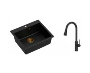 Zestaw zawiera zlewozmywak MORGAN 110 PURE CARBON GraniteQ czarny + bateria kuchenna JESSICA Q LINE z wyciąganą wylewką i funkcją prysznica + syfon save space z odpływem 3,5" SteelQ PVD miedziany