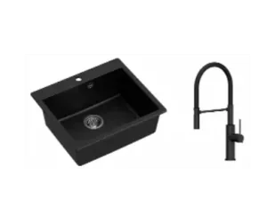 Zestaw zawiera zlewozmywak MORGAN 110 PURE CARBON GraniteQ + bateria kuchenna GEMMA Q LINE SLIM z ruchomą wylewką + syfon save space z odpływem 3,5" SteelQ PVD stalowy