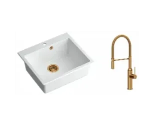 Zestaw zawiera zlewozmywak MORGAN 110 GraniteQ SNOW WHITE + bateria kuchenna MARILYN Q LINE z ruchomą wylewką + syfon save space z odpływem 3,5" SteelQ PVD miedziany
