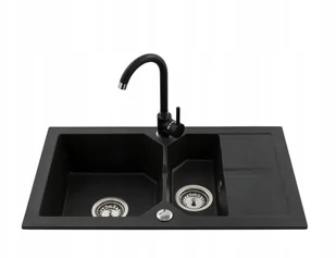 Zlewozmywak półtorakomorowy z ociekaczem Kenzo czarny w zestawie z syfonem przyściennym i baterią Evo Select