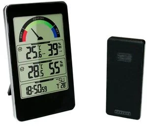 Wyświetlacz, wskaźniki temp, data, godzina, temp. wew/zew. czujnik, higrometr zew/wew. Budzik: Nie Obszar zastosowania: Wewnątrz i na zewnątrz Zakres temperatur: od -50 do +50 st.