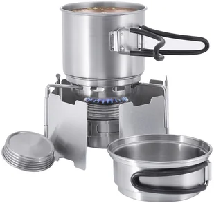 Mała srebrna kuchnia polowa składa się z kuchenki alkoholowej i naczyń. Tatonka Alcohol Burner Set zawiera kuchenkę, dwa rondelki i torbę. Zestaw ma wymiary 8,5 × 8,5 × 13 cm i waży 550 g. Dzięki temu przydatnemu zestawowi można cieszyć się dobrym obiadem nawet w środku lasu.