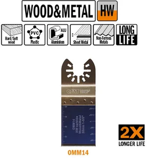 Brzeszczot oscylacyjny 35mm z uchwytem uniwersalnym z podwyższoną żywotnością do cięcia wgłębnego o uniwersalnym zastosowaniu CMT Nr kat. OMM14-X1 Typ ostrza: Ostrza węglikowe najwyższej jakości. Materiał: Drewno, hartowane gwoździe i wkręty, płyty gipsowo-kartonowe, tworzywa sztuczne, blacha, miedź, aluminium i stal nierdzewna (INOX). Zastosowanie: