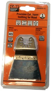 Brzeszczot oscylacyjny 68mm precyzyjny z uchwytem uniwersalnym do drewna CMT Nr kat. OMM06-X1 Typ ostrza: HCS (stal węglowa) z dwurzędowym utwardzonym ostrzem typu japońskiego. Materiał: Drewno, drewno stolarskie, płyty stolarskie, płyta wiórowa. Zastosowanie: