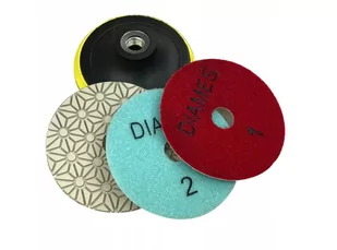 KOMPLET 3 SZT DYSKÓW POLERSKICH DIAMENTOWYCH 3 - STOPNIOWYCH FI 100 DO POLEROWANIA KAMIENIA, GRANITU + UCHWYT PLASTIKOWY Z PIANKĄ MARKA: DIAMES GRADACJA #1, #2, #3 DYSKI POLERSKIE DO PRACY NA MOKRO ŚREDNICA: FI 100 MM GRADACJA: #1, #2, #3 MOCOWANIE: VELCRO - RZEP UCHWYT PLASTIKOWY Z PIANKĄ FI 100 MM / M14 ZASTOSOWANIE: