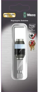 Uchwyt uniwersalny do grotów sześciokątnych 1/4" wg DIN ISO 1173-C 6,3 i końcówek E 6,3 (ISO 1173). Wykonanie ze stali nierdzewnej zapobiegającej powstawaniu korozji nalotowej. Technologia Rapidaptor pozwala na zamocowanie grotu lub końcówki bez konieczności przesuwania pierścienia przytrzymującego. Wymiana narzędzia następuje poprzez przesunięcie pierścienia przytrzymującego do przodu, co pozwala na szybką obsługę jedną ręką. Chwyt sześciokątny 1/4", do wkrętarek z uchwytem wg DIN ISO 1173-F 6,3.