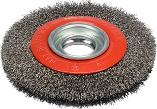 Szczotka rotacyjna przeznaczona do czyszczenia i polerowania powierzchni metalowych, powłok malarskich, a także do usuwania rdzy i czyszczenia narzędzi, przy użyciu szlifierki stołowej.