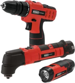 Bardzo praktyczny zestaw urządzeń Modeco składający się z wiertarko-wkrętarki, urządzenia wielofunkcyjnego oraz latarki.