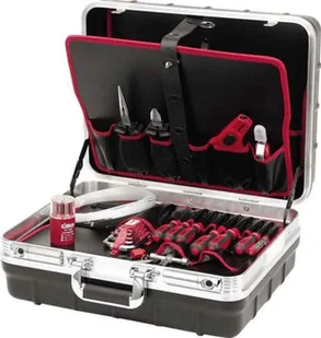 Cimco tools master case electric classic 170331, opakowanie jednostkowe: 1 szt, EAN: 4021103703311 Profesjonalna twarda walizka wykonana z odpornego na uderzenia tworzywa ABS o grubości 3 mm z aluminiową ramą, 3 tablice narzędziowe z wieloma przegródkami, oddzielny schowek na dokumenty, podstawka z indywidualnie regulowanymi przegródkami na małe części, przyrządy pomiarowe, narzędzia itp, 2 zamykane zamki w komplecie z 23 narzędziami, obcinak do przewodów nr 10 9686, obcinak elektroniczny nr 10 1040, szczypce telefoniczne, proste nr 10 9216, szczypce do pomp wodnych nr 10 9224, szczypce telefoniczne, zakrzywione nr 10 9238, szczypce kombinowane nr 10 9336, obcinak boczny nr 10 9528, rozwiertak nr 11 0482, zestaw kluczy trzpieniowych nr 11 0590, próbnik napięcia nr 11 1280, wkrętak precyzyjny nr. 11 1864, wkrętak płaski z izolacją ochronną 1000 V nr 11 7702, nr 11 7704, nr 11 7705, nr 11 7706, wkrętak krzyżakowy z izolacją ochronną 1000 V nr 11 7731, nr art. 11 7732, nr art.