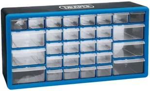 Organizer na narzędzia z 30 szufladami firmy Draper Tools jest odpowiedni do przechowywania wielu rodzajów przedmiotów. Oragnizer wyposażono w 24 średnie i 6 dużych szuflad do porządkowania i przechowywania małych narzędzi ręcznych oraz akcesoriów, takich jak złączki. Szufladki wykonane są z przezroczystego plastiku, co ułatwia identyfikację zawartości, a rama z mocnego i odpornego na uderzenia plastiku. Szuflady można zablokować, aby się nie otwierały. Organizer posiada otwory do mocowania na ścianie.