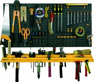 Tablica warsztatowa firmy ArtPlast Zestaw: zawieszana półka, 50 akcesoriów Tablica warsztatowa narzędziowa Wykonana z polipropylenu (PP) Wymiary półek: 49,5 x 21,5 x 5,0 cm - 2 sztuki Wymiary tablic (2 szt. w zestawie): szerokość 50 cm wysokość 50 cm głębokość 2 cm Uchwyty haczyki małe 4 szt. haczyki duże 16 szt.