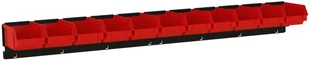 Zawieszka ZW-P1-11 - przystosowana do zawieszenia 11 pojemników P1 o wymiarach: szerokość 77 mm, głębokość 119 mm, wysokość 56 mm - zawieszka z zaczepami do mocowania na perforacji tablicy narzędziowej, lub płyty perforowanej - rozstaw zaczepów do kratownicy 32 mm - wielkość oczka do perforacji 10 mm - szerokość zawieszki 866 mm - wysokość zawieszki 95 mm - głębokość zawieszki 20 mm - zabezpieczenie przed wysunięciem z perforacji - klips pozycjonujący w zestawie - wykonanie z blachy stalowej o grubości 1,0 mm - malowana farbą proszkową w kolorze czarnym - zawieszka sprzedawana bez pojemników (pojemniki można nabyć oddzielnie)