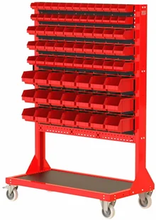 stojak narzędziowy ST 110-11; 3 listwy na pojemniki ZW-P3-7; 3 listwy na pojemniki ZW-P2-10; 2 listwy na pojemniki ZW-P1-13; 21 pojemników P3; 30 pojemników P2; 26 pojemników P1 - solidna konstrukcja stojaka wykonana z blachy o grubości 2,0 mm - stojak jednostronny - kratownica narzędziowa umożliwiająca dowolną konfiguracje zawieszek narzędziowych, bądź listew na pojemniki zależnie od potrzeb - boczny uchwyt umożliwiający łatwy transport stojaka - mocowanie koła do stalowej płyty o grubości 5,0 mm - dolna półka wyłożona gumową matą ochronna ogólnego przeznaczenia o grubości 2mm w kolorze czarnym - waga stojaka: 75 kg Szerokość 1136mm Głębokość 600mm Wysokość całkowita 1690mm Konstrukcja Wysokiej jakości blacha stalowa gr. 2,0mm Powłoka malarska Malowanie proszkowe Dostępne kolory Możliwość wyboru obok zdjęcia produktu Ochronna mata Tak. Na półce. Koła 2 stałe i 2 obrotowe (fi 125mm). Hamulec Tak.