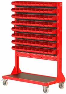stojak narzędziowy ST 110-11; 8 listew na pojemniki ZW-P2-10; 80 pojemników P2 - solidna konstrukcja stojaka wykonana z blachy o grubości 2,0 mm - stojak jednostronny - kratownica narzędziowa umożliwiająca dowolną konfiguracje zawieszek narzędziowych, bądź listew na pojemniki zależnie od potrzeb - boczny uchwyt umożliwiający łatwy transport stojaka - mocowanie koła do stalowej płyty o grubości 5,0 mm - dolna półka wyłożona gumową matą ochronna ogólnego przeznaczenia o grubości 2mm w kolorze czarnym - waga stojaka: 72 kg Szerokość 1136mm Głębokość 600mm Wysokość całkowita 1690mm Konstrukcja Wysokiej jakości blacha stalowa gr. 2,0mm Powłoka malarska Malowanie proszkowe Dostępne kolory Możliwość wyboru obok zdjęcia produktu Ochronna mata Tak. Na półce. Koła 2 stałe i 2 obrotowe (fi 125mm). Hamulec Tak.