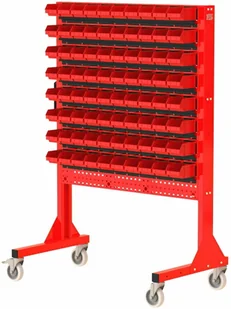 stojak narzędziowy ST 110-12; 8 listew na pojemniki ZW-P2-10; 80 pojemników P2 - solidna konstrukcja stojaka wykonana z blachy o grubości 2,0 mm - stojak jednostronny - kratownica narzędziowa umożliwiająca dowolną konfiguracje zawieszek narzędziowych, bądź listew na pojemniki zależnie od potrzeb - boczny uchwyt umożliwiający łatwy transport stojaka - mocowanie koła do stalowej płyty o grubości 5,0 mm - waga stojaka: 57 kg Szerokość 1136mm Głębokość 600mm Wysokość całkowita 1685mm Konstrukcja Wysokiej jakości blacha stalowa gr. 2,0mm Powłoka malarska Malowanie proszkowe Dostępne kolory Możliwość wyboru obok zdjęcia produktu Koła 2 stałe i 2 obrotowe (fi 125mm). Hamulec Tak. W jednym kole.