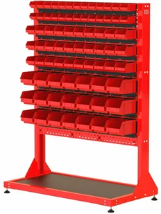 stojak narzędziowy ST 110-13; 3 listwy na pojemniki ZW-P3-7; 3 listwy na pojemniki ZW-P2-10; 2 listwy na pojemniki ZW-P1-13; 21 pojemników P3; 30 pojemników P2; 26 pojemników P1 - solidna konstrukcja stojaka wykonana z blachy o grubości 2,0 mm - stojak jednostronny - kratownica narzędziowa umożliwiająca dowolną konfiguracje zawieszek narzędziowych, bądź listew na pojemniki zależnie od potrzeb - dolna półka wyłożona gumową matą ochronna ogólnego przeznaczenia o grubości 2mm w kolorze czarnym.
