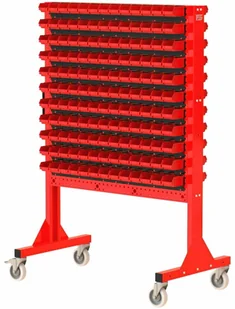 stojak narzędziowy ST 110-22; 22 listew na pojemniki ZW-P1-13; 286 pojemników P1 - solidna konstrukcja stojaka wykonana z blachy o grubości 2,0 mm - stojak dwustronny - kratownica narzędziowa umożliwiająca dowolną konfiguracje zawieszek narzędziowych, bądź listew na pojemniki zależnie od potrzeb - perforacja Oczko 10x10mm, odstęp pomiędzy oczkami 32mm - szeroki wybór zawieszek na narzędzia bądź pojemniki - boczny uchwyt umożliwiający łatwy transport stojaka - mocowanie koła do stalowej płyty o grubości 5,0 mm - waga stojaka: 97 kg Szerokość 1136mm Głębokość 600mm Wysokość całkowita 1685mm Konstrukcja Wysokiej jakości blacha stalowa gr. 2,0mm Powłoka malarska Malowanie proszkowe Dostępne kolory Możliwość wyboru obok zdjęcia produktu Koła 2 stałe i 2 obrotowe (fi 125mm). Hamulec Tak. W jednym kole.