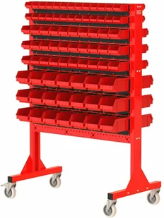 stojak narzędziowy ST 110-22; 6 listew na pojemniki ZW-P3-7; 6 listew na pojemniki ZW-P2-10; 4 listwy na pojemniki ZW-P1-13; 42 pojemników P3; 60 pojemników P2; 52 pojemników P1 - solidna konstrukcja stojaka wykonana z blachy o grubości 2,0 mm - stojak dwustronny - kratownica narzędziowa umożliwiająca dowolną konfiguracje zawieszek narzędziowych, bądź listew na pojemniki zależnie od potrzeb - perforacja Oczko 10x10mm, odstęp pomiędzy oczkami 32mm - szeroki wybór zawieszek na narzędzia bądź pojemniki - boczny uchwyt umożliwiający łatwy transport stojaka - mocowanie koła do stalowej płyty o grubości 5,0 mm - waga stojaka: 99 kg Szerokość 1136mm Głębokość 600mm Wysokość całkowita 1685mm Konstrukcja Wysokiej jakości blacha stalowa gr. 2,0mm Powłoka malarska Malowanie proszkowe Dostępne kolory Możliwość wyboru obok zdjęcia produktu Koła 2 stałe i 2 obrotowe (fi 125mm). Hamulec Tak. W jednym kole.