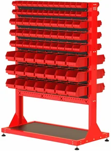 stojak narzędziowy ST 110-23; 6 listew na pojemniki ZW-P3-7; 6 listew na pojemniki ZW-P2-10; 4 listwy na pojemniki ZW-P1-13; 42 pojemników P3; 60 pojemników P2; 52 pojemników P1 - solidna konstrukcja stojaka wykonana z blachy o grubości 2,0 mm - stojak dwustronny - kratownica narzędziowa umożliwiająca dowolną konfiguracje zawieszek narzędziowych, bądź listew na pojemniki zależnie od potrzeb - perforacja Oczko 10x10mm, odstęp pomiędzy oczkami 32mm - szeroki wybór zawieszek na narzędzia bądź pojemniki - stojak oparty na stopkach poziomujących - dolna półka wyłożona gumową matą ochronna ogólnego przeznaczenia o grubości 2mm w kolorze czarnym - waga stojaka: 106,8 kg Szerokość 11360mm Głębokość 600mm Wysokość całkowita 1577mm Konstrukcja Wysokiej jakości blacha stalowa gr. 2,0mm Powłoka malarska Malowanie proszkowe Dostępne kolory Możliwość wyboru obok zdjęcia produktu Perforacja Oczko 10x10mm, odstęp pomiędzy oczkami 32mm. Sposób wysyłki Całkowicie zmontowane. Gotowe do użytku.