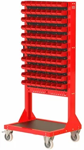 stojak narzędziowy ST 70-11; 11 listew na pojemniki ZW-P1-8; 88 pojemników P1 - solidna konstrukcja stojaka wykonana z blachy o grubości 2,0 mm - stojak jednostronny - kratownica narzędziowa umożliwiająca dowolną konfiguracje zawieszek narzędziowych, bądź listew na pojemniki zależnie od potrzeb - dolna półka wyłożona gumową matą ochronna ogólnego przeznaczenia o grubości 2mm w kolorze czarnym - boczny uchwyt umożliwiający łatwy transport stojaka - mocowanie koła do stalowej płyty o grubości 5,0 mm - waga stojaka: 50 kg Szerokość 720mm Głębokość 600mm Wysokość całkowita 1690mm Konstrukcja Wysokiej jakości blacha stalowa gr. 2,0mm Powłoka malarska Malowanie proszkowe Dostępne kolory Możliwość wyboru obok zdjęcia produktu Ochronna mata Tak. Na półce. Koła 2 stałe i 2 obrotowe (fi 125mm). Hamulec Tak.