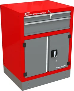Szafka warsztatowa z 2 szufladami i drzwiami T-31 2 szuflady na stalowych teleskopowych prowadnicach kulkowych z pełnym wysuwem wysuw szuflad 95 % odciążenie statyczne jednej szuflady do 60 kg centralna blokada zamykająca wszystkie szuflady po przekręceniu kluczyka centralny zamek blokujący z dwoma kluczami w komplecie w systemie Master Key dno każdej szuflady wyłożone gumową matą tłumiącą ogólnego przeznaczenia o grubości 2,0 mm uchwyt do otwierania profilowany z czoła szuflady, dodatkowo wyposażony w nakładkę wykonaną z blachy nierdzewnej ułatwiającą utrzymanie szafek w należytej czystości boki szafki przystosowane do zamontowania płyt perforowanych na zawieszki narzędziowe pod szufladami komora zamykana podwójnymi drzwiami oraz dodatkowo zamkiem baskwilowym z dwoma kluczami w komplecie drzwi osadzone na zewnętrznych zawiasach Elesa Ganter z kątem otwarcia 180 stopni wygodny uchwyt profilowany na całej wysokości drzwiczek dodatkowo wyposażony w nakładkę wykonaną z blachy nierdzewnej ułatwiającą utrzymanie szafek w należytej czystości wewnątrz komory znajduje się przestawna półka wyłożona tłumiącą matą gumową ogólnego przeznaczenia obciążenie statyczne półki do 40 kg konstrukcja szafki wykonana z blachy stalowej o grubości 1 mm cokół wykonany z ocynkowanej blachy stalowej o grubości 1,5mm elementy składowe cokołu skręcane w celu wyeliminowania przypadkowych ognisk korozji możliwość przykręcenia cokołu do podłoża możliwość pomalowania w dowolnym podstawowym kolorze palety RAL (w cenie) szafka warsztatowa linii TITANIUM stanowi podstawę stołów warsztatowych w tej samej linii Wymiary użytkowe szuflad: 1 x szuflada niska 70 wysokość czoła szuflady 66 mm wysokość wewnętrzna użytkowa 56 mm szerokość wewnętrzna użytkowa 560 mm głębokość wewnętrzna użytkowa 410 mm 1 x szuflada średnia 140 wysokość czoła szuflady 136 mm wysokość wewnętrzna użytkowa 119 mm szerokość wewnętrzna użytkowa 560 mm głębokość wewnętrzna użytkowa 410 mm 1 x drzwiczki małe podwójne wysokość wewnętrzna światła drzwi 579 mm szerokość wewnętrzna światła drzwi 580 mm głębokość wewnętrzna użytkowa 508 mm dokładne wymiary w galerii zdjęć Waga szafki 50,5 kg Wyposażenie opcjonalne (dodatkowo płatne): blokada zapobiegająca wysunięciu więcej niż jednej szuflady boczne płyty perforowane przystosowane do zawieszenia zawieszek systemowych na narzędzia (np. zawieszka na czyściwo) blat ze sklejki o gr. 40mm przestawne podziałki / przegrody do przechowywania drobnych elementów klucz Master Key, umożliwia dostęp do dowolnej liczy szafek za pomocą klucza grupowego przy zachowaniu kluczy indywidualnych.