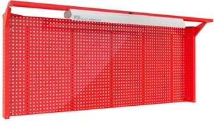 Tablica warsztatowa N-223-01 - konstrukcja nóg tablicy wykonana z wysokiej jakości blachy stalowej o grubości 1,5mm - płyty perforowana wykonane z wysokiej jakości blachy stalowej o grubości 1,0mm - tylna ściana tablicy wykonana z płyty perforowanej umożliwiającej zamontowanie zawieszek systemowych - perforacja tylnej ściany oczko 10x10mm w rozstawie co 32mm - dodatkowe wzmocnienia tylnej perforowanej ściany - tablica przystosowana do montażu bezpośrednio na blacie stołu lub zawieszenia na ścianie - montaż nóg do blatu stołu za pomocą dedykowanych wsporników - nogi tablicy posiadają perforację umożliwiającej zamontowanie zawieszek systemowych - dodatkowe wzmocnienia stabilizujące nogi z płytą perforowaną - wsporniki oświetlenia wykonane z blachy stalowej o grubości 2,0mm - oprawa oświetleniowa LED o parametrach 5000LM PRM IP40 840 (41W) - dodatkowo oprawa wyposażona w odbłyśnik - w belce oświetlenia zainstalowany wyłącznik oświetlenia - przewód zasilający o dł.