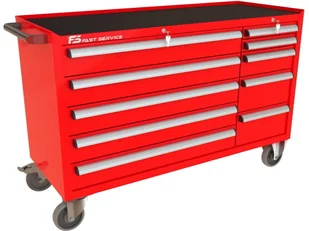 Wózek warsztatowy MEGA z 10 szufladami PM-215-22 10 szuflad na stalowych teleskopowych prowadnicach kulkowych z pełnym wysuwem wysuw szuflad 97 % odciążenie statyczne jednej szuflady do 60 kg centralna blokada zamykająca wszystkie szuflady po przekręceniu kluczyka centralny zamek blokujący z dwoma kluczami w komplecie w systemie Master Key blokada zapobiegająca wysunięciu więcej niż jednej szuflady dno każdej szuflady wyłożone gumową matą tłumiącą ogólnego przeznaczenia o grubości 2,0 mm blat wózka wyłożony tłumiącą matą gumową benzyno olejo odporną o grubości 2,0 mm przykręcany aluminiowy, anodowany i satynowany uchwyt szuflady z zabezpieczeniem bocznych krawędzi wkładką z tworzywa konstrukcja szafki wykonana z blachy stalowej o grubości 1,5 mm wzmocnienia podstawy kół wykonane z blachy stalowej o grubości 2,0 mm 4 koła o średnicy 160 mm Colson Performa 2 stałe + dwa obrotowe w tym jedno z hamulcem opona koła wykonana z niebrudzącej syntetycznej gumy szarej, odpornej na smary benzyny ługi produkt wyposażony w solidny boczy uchwyt pomocny przy manewrowaniu obciążonym wózkiem Wymiary użytkowe szuflad: 5 x szuflada średnia 140 szeroka wysokość czoła szuflady 136 mm wysokość wewnętrzna użytkowa 119 mm szerokość wewnętrzna użytkowa 966 mm głębokość wewnętrzna użytkowa 408 mm 2 x szuflada niska 70 wąska wysokość czoła szuflady 66 mm wysokość wewnętrzna użytkowa 56 mm szerokość wewnętrzna użytkowa 368 mm głębokość wewnętrzna użytkowa 408 mm 1 x szuflada średnia 140 wąska wysokość czoła szuflady 136 mm wysokość wewnętrzna użytkowa 119 mm szerokość wewnętrzna użytkowa 368 mm głębokość wewnętrzna użytkowa 408 mm 2 x szuflada wysoka 210 wąska wysokość czoła szuflady 206 mm wysokość wewnętrzna użytkowa 197 mm szerokość wewnętrzna użytkowa 966 mm głębokość wewnętrzna użytkowa 408 mm dokładne wymiary w galerii zdjęć Waga wózka 174 kg Wyposażenie opcjonalne (dodatkowo płatne): blat wózka wykonany ze sklejki o gr. 40 mm przestawne podziałki / p