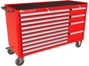 Wózek warsztatowy MEGA z 14 szufladami PM-210-23 14 szuflad na stalowych teleskopowych prowadnicach kulkowych z pełnym wysuwem wysuw szuflad 97 % odciążenie statyczne jednej szuflady do 60 kg centralna blokada zamykająca wszystkie szuflady po przekręceniu kluczyka centralny zamek blokujący z dwoma kluczami w komplecie w systemie Master Key blokada zapobiegająca wysunięciu więcej niż jednej szuflady dno każdej szuflady wyłożone gumową matą tłumiącą ogólnego przeznaczenia o grubości 2,0 mm blat wózka wyłożony tłumiącą matą gumową benzyno olejo odporną o grubości 2,0 mm przykręcany aluminiowy, anodowany i satynowany uchwyt szuflady z zabezpieczeniem bocznych krawędzi wkładką z tworzywa konstrukcja szafki wykonana z blachy stalowej o grubości 1,5 mm wzmocnienia podstawy kół wykonane z blachy stalowej o grubości 2,0 mm 4 koła o średnicy 160 mm Colson Performa 2 stałe + dwa obrotowe w tym jedno z hamulcem opona koła wykonana z niebrudzącej syntetycznej gumy szarej, odpornej na smary benzyny ługi produkt wyposażony w solidny boczy uchwyt pomocny przy manewrowaniu obciążonym wózkiem Wymiary użytkowe szuflad: 10 x szuflada niska 70 szeroka wysokość czoła szuflady 66 mm wysokość wewnętrzna użytkowa 56 mm szerokość wewnętrzna użytkowa 966 mm głębokość wewnętrzna użytkowa 408 mm 2 x szuflada średnia 140 wąska wysokość czoła szuflady 136 mm wysokość wewnętrzna użytkowa 119 mm szerokość wewnętrzna użytkowa 368 mm głębokość wewnętrzna użytkowa 408 mm 2 x szuflada wysoka 210 wąska wysokość czoła szuflady 206 mm wysokość wewnętrzna użytkowa 197 mm szerokość wewnętrzna użytkowa 966 mm głębokość wewnętrzna użytkowa 408 mm dokładne wymiary w galerii zdjęć Waga wózka 208 kg Wyposażenie opcjonalne (dodatkowo płatne): blat wózka wykonany ze sklejki o gr. 40 mm przestawne podziałki / p