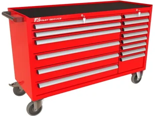 Wózek warsztatowy MEGA z 14 szufladami PM-214-16 14 szuflad na stalowych teleskopowych prowadnicach kulkowych z pełnym wysuwem wysuw szuflad 97 % odciążenie statyczne jednej szuflady do 60 kg centralna blokada zamykająca wszystkie szuflady po przekręceniu kluczyka centralny zamek blokujący z dwoma kluczami w komplecie w systemie Master Key blokada zapobiegająca wysunięciu więcej niż jednej szuflady dno każdej szuflady wyłożone gumową matą tłumiącą ogólnego przeznaczenia o grubości 2,0 mm blat wózka wyłożony tłumiącą matą gumową benzyno olejo odporną o grubości 2,0 mm przykręcany aluminiowy, anodowany i satynowany uchwyt szuflady z zabezpieczeniem bocznych krawędzi wkładką z tworzywa konstrukcja szafki wykonana z blachy stalowej o grubości 1,5 mm wzmocnienia podstawy kół wykonane z blachy stalowej o grubości 2,0 mm 4 koła o średnicy 160 mm Colson Performa 2 stałe + dwa obrotowe w tym jedno z hamulcem opona koła wykonana z niebrudzącej syntetycznej gumy szarej, odpornej na smary benzyny ługi produkt wyposażony w solidny boczy uchwyt pomocny przy manewrowaniu obciążonym wózkiem Wymiary użytkowe szuflad: 2 x szuflada niska 70 szeroka wysokość czoła szuflady 66 mm wysokość wewnętrzna użytkowa 56 mm szerokość wewnętrzna użytkowa 966 mm głębokość wewnętrzna użytkowa 408 mm 4 x szuflada średnia 140 szeroka wysokość czoła szuflady 136 mm wysokość wewnętrzna użytkowa 119 mm szerokość wewnętrzna użytkowa 966 mm głębokość wewnętrzna użytkowa 408 mm 7 x szuflada niska 70 wąska wysokość czoła szuflady 66 mm wysokość wewnętrzna użytkowa 56 mm szerokość wewnętrzna użytkowa 368 mm głębokość wewnętrzna użytkowa 408 mm 1 x szuflada wysoka 210 wąska wysokość czoła szuflady 206 mm wysokość wewnętrzna użytkowa 197 mm szerokość wewnętrzna użytkowa 966 mm głębokość wewnętrzna użytkowa 408 mm dokładne wymiary w galerii zdjęć Waga wózka 192 kg Wyposażenie opcjonalne (dodatkowo płatne): blat wózka wykonany ze sklejki o gr. 40 mm przestawne podziałki / p