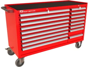 Wózek warsztatowy MEGA z 17 szufladami PM-211-12 17 szuflad na stalowych teleskopowych prowadnicach kulkowych z pełnym wysuwem wysuw szuflad 97 % odciążenie statyczne jednej szuflady do 60 kg centralna blokada zamykająca wszystkie szuflady po przekręceniu kluczyka centralny zamek blokujący z dwoma kluczami w komplecie w systemie Master Key blokada zapobiegająca wysunięciu więcej niż jednej szuflady dno każdej szuflady wyłożone gumową matą tłumiącą ogólnego przeznaczenia o grubości 2,0 mm blat wózka wyłożony tłumiącą matą gumową benzyno olejo odporną o grubości 2,0 mm przykręcany aluminiowy, anodowany i satynowany uchwyt szuflady z zabezpieczeniem bocznych krawędzi wkładką z tworzywa konstrukcja szafki wykonana z blachy stalowej o grubości 1,5 mm wzmocnienia podstawy kół wykonane z blachy stalowej o grubości 2,0 mm 4 koła o średnicy 160 mm Colson Performa 2 stałe + dwa obrotowe w tym jedno z hamulcem opona koła wykonana z niebrudzącej syntetycznej gumy szarej, odpornej na smary benzyny ługi produkt wyposażony w solidny boczy uchwyt pomocny przy manewrowaniu obciążonym wózkiem Wymiary użytkowe szuflad: 8 x szuflada niska 70 szeroka wysokość czoła szuflady 66 mm wysokość wewnętrzna użytkowa 56 mm szerokość wewnętrzna użytkowa 966 mm głębokość wewnętrzna użytkowa 408 mm 1 x szuflada średnia 140 szeroka wysokość czoła szuflady 136 mm wysokość wewnętrzna użytkowa 119 mm szerokość wewnętrzna użytkowa 966 mm głębokość wewnętrzna użytkowa 408 mm 6 x szuflada niska 70 wąska wysokość czoła szuflady 66 mm wysokość wewnętrzna użytkowa 56 mm szerokość wewnętrzna użytkowa 368 mm głębokość wewnętrzna użytkowa 408 mm 2 x szuflada średnia 140 wąska wysokość czoła szuflady 136 mm wysokość wewnętrzna użytkowa 119 mm szerokość wewnętrzna użytkowa 368 mm głębokość wewnętrzna użytkowa 408 mm dokładne wymiary w galerii zdjęć Waga wózka 214,5 kg Wyposażenie opcjonalne (dodatkowo płatne): blat wózka wykonany ze sklejki o gr. 40 mm przestawne podziałki / p