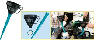 Wyposażenie: Nadaje się do napełniania wszelkich standardowych cieczy i płynów warsztatowych, jak oleje, paliwa lub płyny hamulcowe $580 Lejek warsztatowy z polipropylenu, przewód wężowy z polietylenu oraz sitko w lejku ze stali szlachetnej $581 Średnica lejka: 165 mm $582 Długość wraz z przewodem wężowym: 480 mm $583 Masa netto: 015 kg