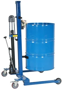 Hydrauliczny podnośnik przeznaczony do podnoszenia i przewożenia 200-litrowych beczek stalowych. Beczka jest zablokowana i stabilna podczas przenoszenia. Doskonałe rozwiązanie przy podnoszeniu i przewożeniu bębnów w większości pojazdów ciężarowych. Proste podnoszenie za pomocą pedału nożnego i opuszczanie z ręcznie obsługiwanym uchwytem. Odległość między podporami = 870 mm.