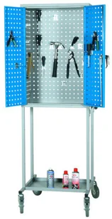 wyposażenie zakładu - szafka dodatkowa: nie, Wózek warsztatowy ma stabilną konstrukcję z szafą z perforowanej stali oraz prostokątną półką w podwoziu. Wózek posiada cztery obrotowe kółka, z których dwa są blokowane. Dostarczany jest z zestawem 20 różnych haczyków. Wymiary konstrukcji: