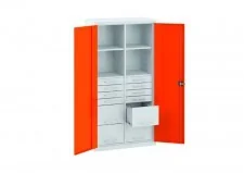 Meble te są niezwykle stabilne, wytrzymałe oraz odporne na różnego rodzaju wstrząsy i uderzenia. Szafa warsztatowa SL 163. 18 wykonana jest z blachy stalowej, która dla podwyższenia odporności na korozję, pomalowana została w technologii proszkowej. Wyposażona jest w przegrodę, 4 ocynkowane półki o nośności 75 kg, w 4 wysokie szyflady oraz w 8 niskich, o nośności 35 kg. Ponadto zostały one zamontowane na prowadnicach kulkowych, a ich wysuw wynosi 85%.
