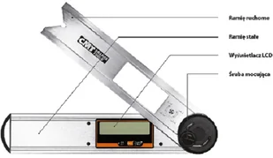 Cyfrowy kątomierz duży CMT Nr kat. DAF-001 Cyfrowy kątomierz jest wielofunkcyjnym urządzeniem pomiarowym. Prosty w obsłudze, posiadający wyświetlacz LCD oraz różne poziomy pomiaru. Zakres pomiaru kątomierza wynosi 0 - 360st z dokładnością do 0,05st; dodatkowo w obudowie znajduje się poziomica zwiększająca dokładność pomiarów. Kątomierz DAF-001 posiada funkcje blokady ostatniego pomiaru, wskaźnik stanu baterii oraz samoczynny wyłącznik, gdy kątomierz nie jest używany przez dłuższy czas.