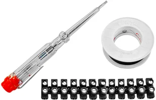 Zestaw do instalacji elektrycznych składający się z testera napięcia, taśmy izolacyjnej i złączy.