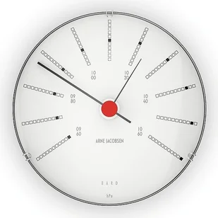Barometr pokojowy AJ BANKERS od Rosendahl to element wchodzący w skład pięknej stacji pogodowej duńskiej marki. Projekt został stworzony przez Arne Jacobsena uważanego za jednego z największych na świecie przedstawicieli nurtu modernizmu. Serię Bankers, Jacobsen stworzył w 1971 roku na potrzeby centralnego banku Danii - Nationalbanken. Barometr stanowi kontynuację serii w typowym dla projektanta stylu. Na tarczy dominuje wyrazista czarna wskazówka umieszczona na jasnym tle, która świetnie kontrastuje z czerwoną śrubą.