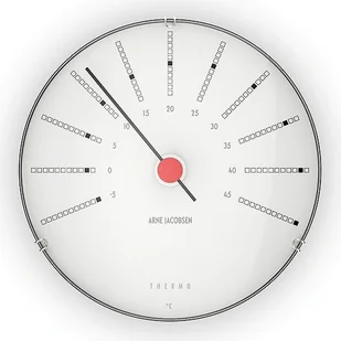 Termometr pokojowy AJ BANKERS od Rosendahl to element wchodzący w skład pięknej stacji pogodowej duńskiej marki. Projekt został stworzony przez Arne Jacobsena uważanego za jednego z największych na świecie przedstawicieli nurtu modernizmu. Serię Bankers, Jacobsen stworzył w 1971 roku na potrzeby centralnego banku Danii - Nationalbanken. Termometr stanowi kontynuację serii w typowym dla projektanta stylu. Na tarczy dominuje wyrazista czarna wskazówka umieszczona na jasnym tle, która świetnie kontrastuje z czerwoną śrubą.
