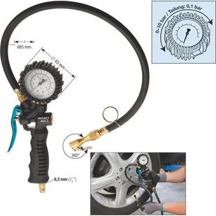 Wyposażenie: Specjalna osłona gumowa chroni manometr przed lekkim obciążeniem udarowym $832 Zakres temperatur: od -10°C do +40°C $833 Uchwyt z dźwignią uruchamiającą do napełniania i opróżniania (obsługa jedną ręką) $834 Wąż ze zintegrowaną szybkozłączką wtykową, możliwość obrotu o 360° $835 Zakres pomiarowy manometru(legalizowany): 0-10 barów $836 Podziałka skali: 0,1 bara $837 Wąż elastyczny $838 Korpus manometru: $83963 mm $840 Długość 685 mm (razem ze złączką) $841 Gwint przyłącza sprężonego powietrza: 12,91 mm (1/4´´) $842 Końcówka do szybkozłącza: zintegrowany, średnica nominalna 7,2 $843 Masa netto: 056 kg