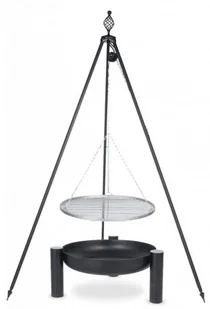 Grill ogrodowy trójnóg, wykonany z wysokiej jakości stali, piaskowany, siatka wykonana ze stali nierdzewnej opuszczana na łańcuchu, statyw stabilny z zaostrzonymi końcami dzięki czemu grill może być umieszczone na nierównej powierzchni, palenisko.