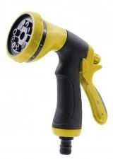 Pistolet plastikowy, 8-funkcyjny do zraszania. Pozwala podlewać różnymi strumieniami wody od skoncentrowanego do rozproszonej mgiełki. Zmiana strumienia wody w bardzo prosty i wygodny sposób.