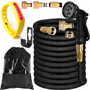 ABS, plastik, lateks, mosiądz Standardowa długość węża po rozciągnięciu: 45m Po złożeniu zajmuje niewiele miejsca W zestawie uchwyt do przechowywania węża Kolor: czarny Produkt zapakowany w estetyczny worek Adapter 3/4" na 1/2" Mosiężna złączka średnicy 3/4"