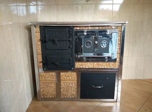 ciepĹa jeszcze dĹugo po wygaĹniÄciu paleniska. Dane techniczne: Wymiary kuchni -wysokoĹÄ 85 cm -szerokoĹÄ 87 cm -gĹÄbokoĹÄ 57 cm - masa 220 kg -nominalna moc grzewcza 8kW** Wymiary komory spalania : -wysokoĹÄ 27cm -szerokoĹÄ 23cm -gĹÄbokoĹÄ 38cm Wymiary piekarnika : -wysokoĹÄ 20cm -szerokoĹÄ 30 cm -gĹÄbokoĹÄ 48 cm -Ĺrednica wylotu spalin fi -130 mm -wylot spalin moĹźe znajdowaÄ siÄ z tyĹu lub z boku pieca -wersja wykonania lewa lub prawa