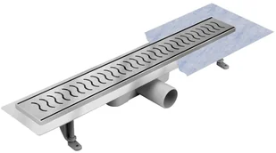 Odpływ liniowy z rusztem w fale 70 cm Odpływ liniowy z rusztem ozdobnym w fale dostępny jest w rozmiarach od 50 cm do 100 cm długości. Niski syfon o przepustowości do 56l/ min zapewnia szybkie odprowadzanie wody z powierzchni prysznica.