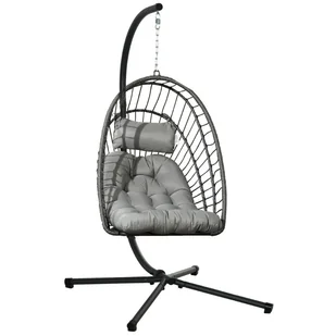 Rattanowy hamak ze składanym stelażem i poduszką, fotel wiszący 194 cm, do użytku wewnątrz/na zewnątrz, do 100 kg, kolor jasnoszary